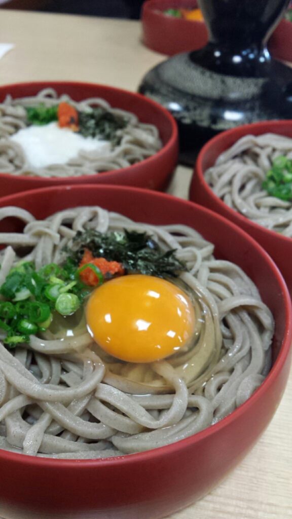 Izumo soba is served in a small round plate.Each type of soba has different toppings,which is a distinctive feature of Izumo soba.